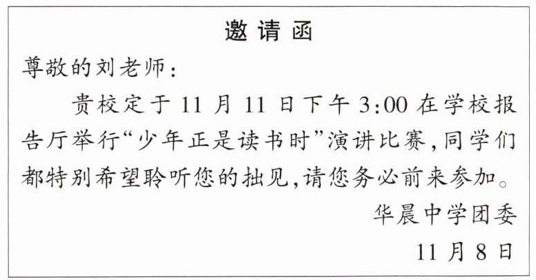 (3)活动中,学校拟邀请市作协作家刘老师对读书演讲活动作指导,下面是学校团委写的一份邀请函,文中有几处用语表达不得体,请你修改。