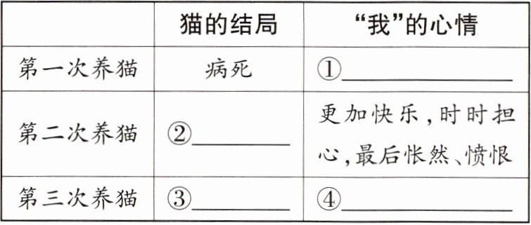 [解析]本题考查人物的情感变化。第②空:根据第 11 段“刚才遇到隔壁周家的丫头,她说,早上看见我家的小猫在门外,被一个过路的人捉去了”,第 13 段“我也怅然地,愤恨地,在诅骂着那个不知名的夺去我们所爱的东西的人”可概括第二只猫的结局为丢失。第③空:根据第 32 段“两个月后,我们的猫忽然死在邻家的屋脊上”可概括第三只猫的结局为死亡。第①空:根据第 1 段“我坐在藤椅上看着他们,可以微笑着消耗过一二小时的光阴,那时太阳光暖暖地照着,心上感着生命的新鲜与快乐”,第 2 段“我心里也感着一缕的酸辛,可怜这两月来相伴的小侣”可概括作者的心情为由快乐转为酸辛。第④空:根据第 15 段“但大家都不喜欢它,它不活泼,也不像别的小猫之喜欢玩游,好像是具着天生的忧郁性似的”,第 32 段“我对于它的亡失,比以前的两只猫的亡失,更难过得多”,第 33 段“我永无改正我的过失的机会了”可概括作者的心情为由不喜欢到悔恨、自责。