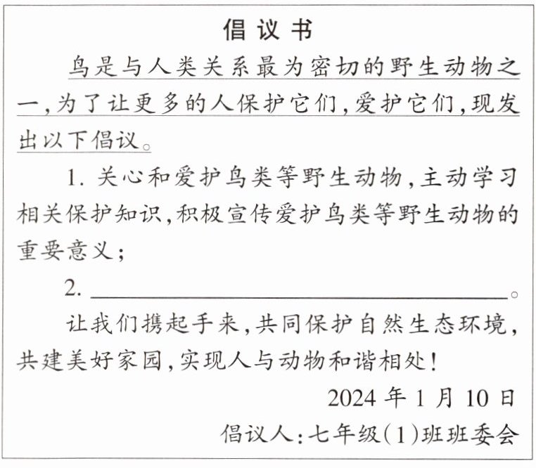 [解析]本题考查倡议书。倡议书落款应先署名再写日期。“现发出以下倡议”后面是倡议的具体内容,故应把句号改为冒号。补充内容围绕如何保护野生动物,言之有理即可。