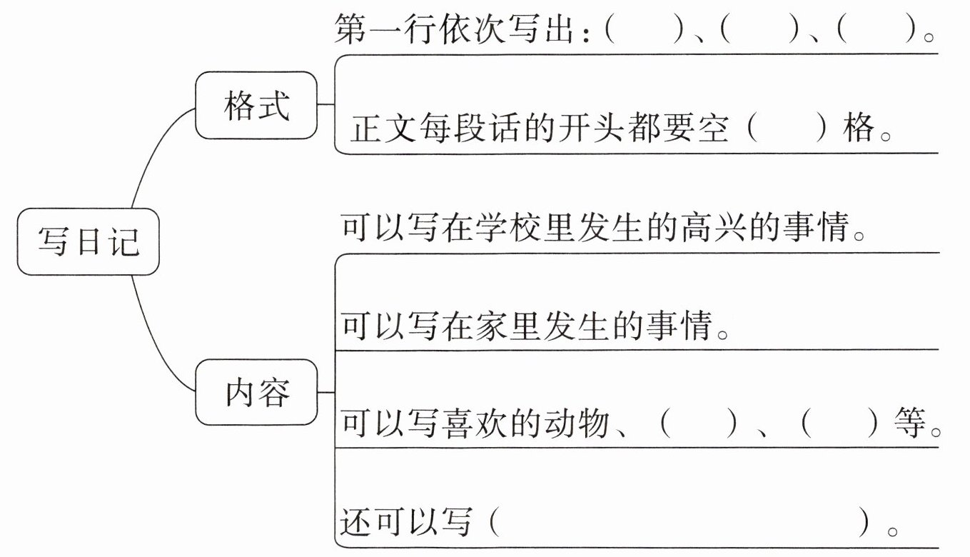 三、根据提示,补充完整自己要写的日记的格式及内容。