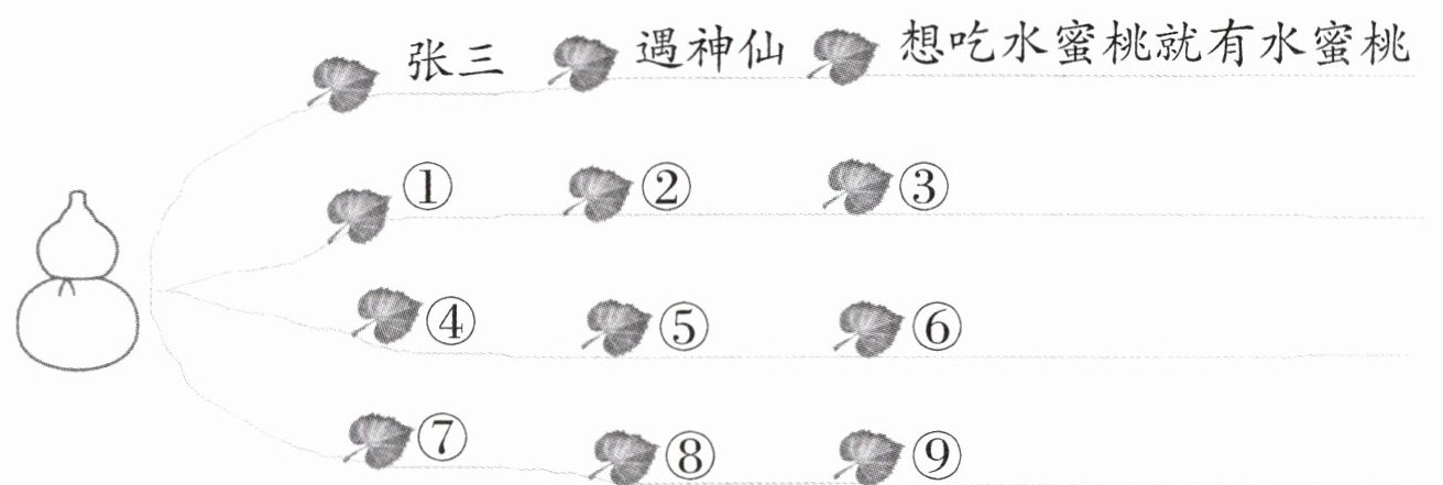 的时候,就会给王葆讲宝葫芦的故事,文中的奶奶讲了哪些宝葫芦的故事呢?请把思维导图补充完整。| 张三 | 遇神仙 | 想吃水蜜桃就有水蜜桃 |