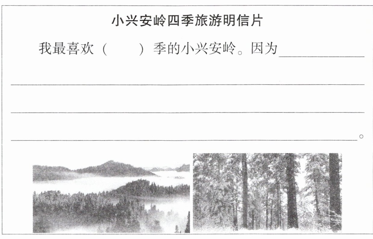 2. 你最喜欢小兴安岭的哪个季节?请结合课文内容说说你的理由,记得用上关键语句,并把它写在四季旅游明信片上。