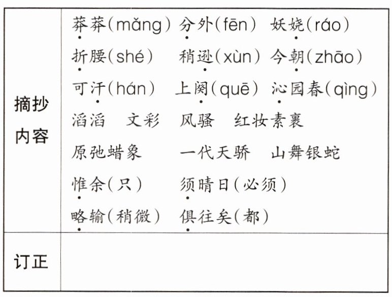 1. 【任务一:笔记摘抄】学习了《沁园春·雪》这首词后,第一小组的林林同学摘抄了一部分生字、生词和词义(如下),请你圈出其中有问题的地方,并帮他订正。