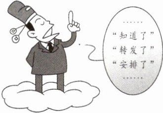 示例:一个戴着官帽,仰着头,反背着右手的官员,举着左手的食指,站在云端大声地说:“知道了”“转发了”“安排了”……