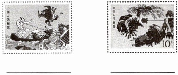 2. 阅读《水浒传》时,第一小组在班级学习群里分享了两枚邮票(如下图),请你根据小说故事情节为两枚邮票分别填写相应标题。
