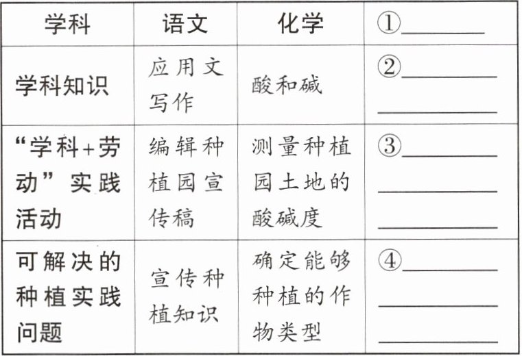 (1)为在各个学科教学中进一步渗透劳动教育。学校结合“种植”劳动特色课程,制订了学习方案(见下表),请你仿照材料中“语文”和“化学”两个学科的学习方案内容,从数学、物理、生物中任选一个学科,设计一份学习方案。(4分)