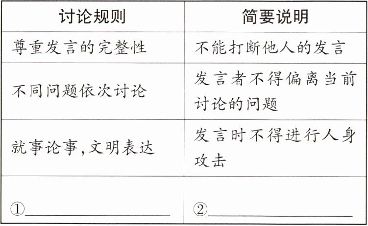 (1)讨论前,班长准备制定一张讨论规则表。请你再补充一项发言规则,使其更完整。