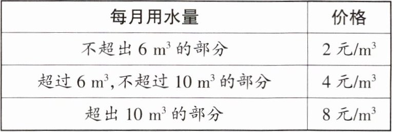 (2)当0<x≤6时,该月的水费为2x元;当6<x≤10时,该月的水费为2×6+4(x-6)=(4x-12)元;当x>10时,该月的水费为2×6+4×(10-6)+8(x-10)=(8x-52)元;