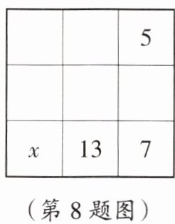 8. 数学文化 幻方是古老的数学问题,我国古代的《洛书》中记载了最早的幻方——九宫格,将9个数填入幻方的空格中,要求九宫格中每一横行、每一竖列以及两条对角线上的3个数之和相等,如图是一个未完成的幻方,则x的值为 (