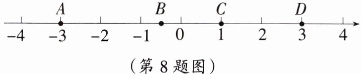 8. 如图,数轴上有 A,B,C,D 四个点,其中绝对值最小的数对应的点是 (