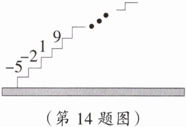 14. 如图,阶梯图的每个台阶上都标着一个数,从下到上的第 $1$ 个至第 $4$ 个台阶上依次标着 $-5$,$-2$,$1$,$9$,且任意相邻四个台阶上数的和都相等。那么,从下到上前 $10$ 个台阶上的数的和是