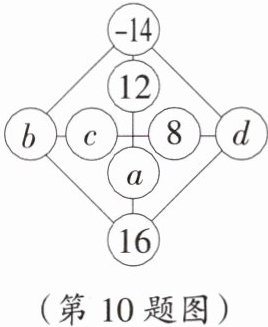 10. 同学们都熟悉“幻方”游戏,现将“幻方”游戏稍作改进变成“幻圆”游戏,将 $-6$,$8$,$-10$,$12$,$-14$,$16$,$-18$,$20$ 分别填入图中的圆圈内,使横、竖以及内外两个正方形顶点处圈内 $4$ 个数字之和都相等,则 $a+b$ 的值为(