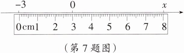 7. 练习衍生教材P11,T1改编 如图,将一刻度尺放在数轴上(数轴的单位长度是1 cm),刻度尺上“0 cm”和“8 cm”分别对应数轴上的-3和x,那么x的值为