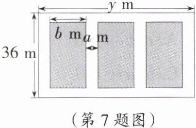 7. 数形结合思想 如图,某学校设计在长为 $ y $ m,宽为 $ 36 $ m 的大长方形场地中,并排新建三个大小一样的标准篮球场,三个篮球场之间及篮球场与长方形场地边沿的距离均为 $ a $ m,篮球场的宽为 $ b $ m。