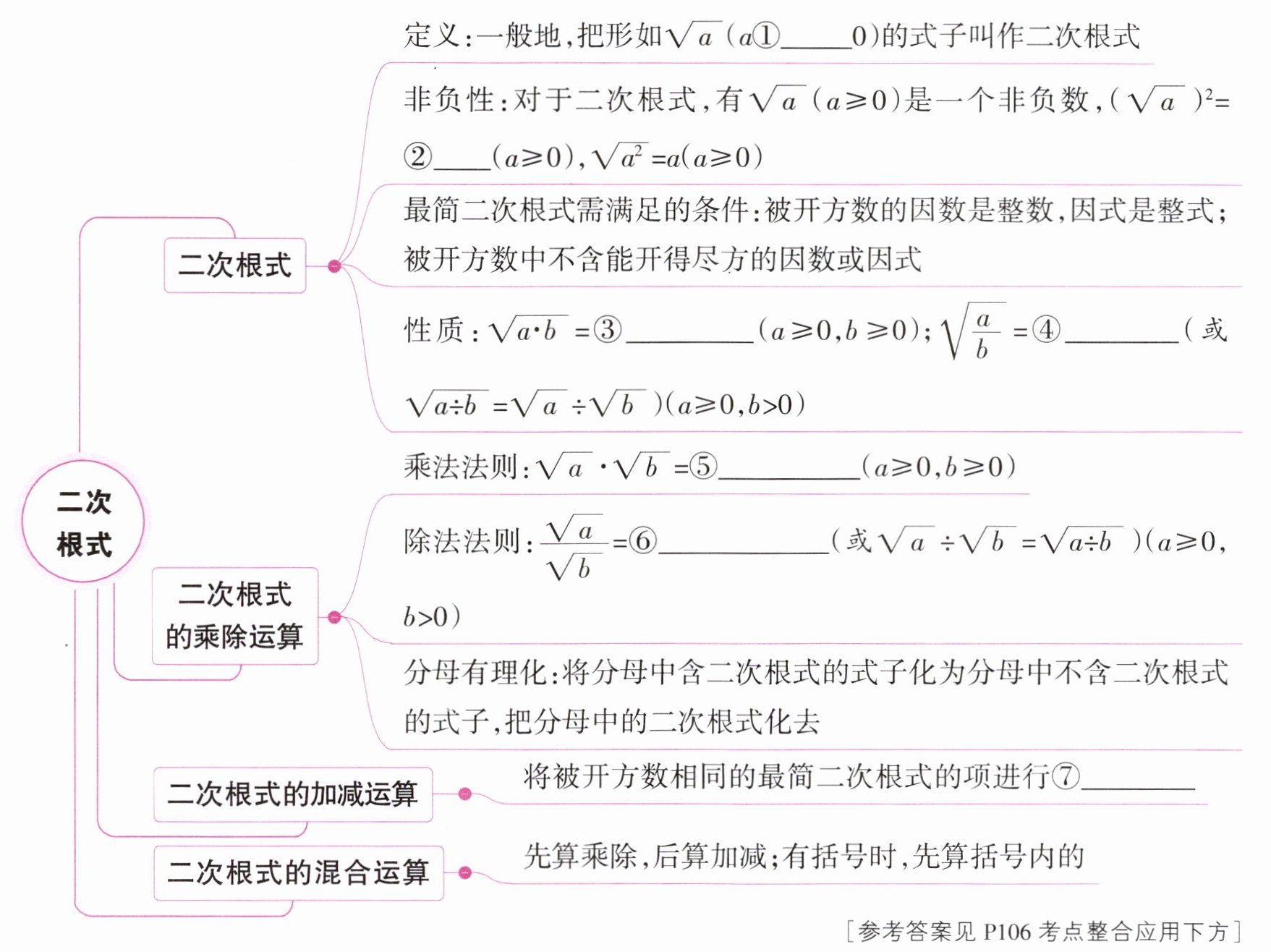 ①$\geqslant$;②$a$;③$\sqrt{a}\cdot\sqrt{b}$;④$\frac{\sqrt{a}}{\sqrt{b}}$;⑤$\sqrt{ab}$;⑥$\sqrt{\frac{a}{b}}$;⑦合并。