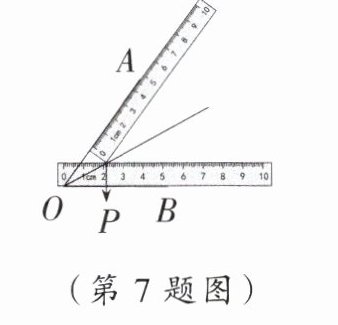 7. 数学模型 将两把相同的直尺按如图所示的方式摆放,记两把直尺的接触点为 P,其中一把直尺边缘和射线 OA 重合,另一把直尺的下边缘与射线 OB 重合,连接 OP 并延长. 若∠BOP= 28°,则∠AOB 的度数为(