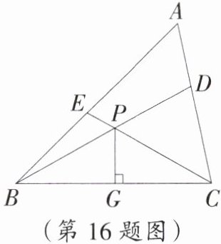 16. (15 分)较难题如图,$ P $ 是 $ \triangle ABC $ 内一点,$ PG $ 是 $ BC $ 的垂直平分线,且 $ \angle PBC = \angle PCB = \frac{1}{2} \angle A $,$ BP $,$ CP $ 的延长线分别交 $ AC $,$ AB $ 于点 $ D $,$ E $.求证:$ BE = CD $.