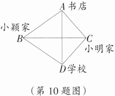 10. 应用意识如图,公路 $ BC $ 所在的直线恰为 $ AD $ 的垂直平分线,则下列说法中:①小明从家到书店与小颖从家到书店一样远;②小明从家到书店与他从家到学校一样远;③小颖从家到书店与她从家到学校一样远;④小明从家到学校与小颖从家到学校一样远. 正确的是