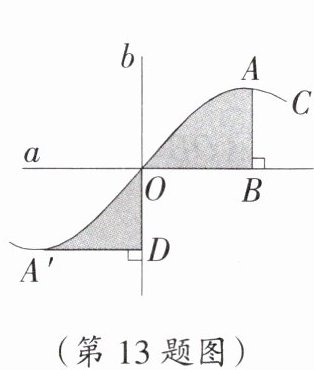 13. 转化思想 如图,直线a,b垂直相交于点O,曲线C关于点O成中心对称,点A的对称点是点A',AB⊥a于点B,A'D⊥b于点D.若OB= 3,OD= 2,则阴影部分的面积之和为
