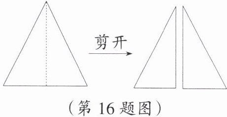 16. 数形结合法几何直观 有一张腰长为$\sqrt{5}$ cm,底边长为2 cm的等腰三角形纸片,如图,小明沿着底边上的中线将纸片剪开,得到两张全等的直角三角形纸片.三角形纸片的高为2 cm.请用这两张直角三角形纸片拼一个中心对称的四边形,要求:画出所有可能的示意图,并在每个示意图上直接标注好各边长,在每个示意图下方直接写出该四边形的周长.