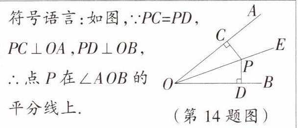 14. 已知角平分线判定定理:角的内部到角两边距离相等的点在这个角的平分线上.
