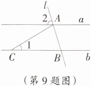 9. 易错题如图,直线a//b,直线l与直线a,b分别相交于点A,B,点C在直线b上,且CA= CB.若∠1= 32°,则∠2的度数为(