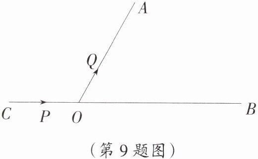9. 较难题 如图,$O是射线CB$上一点,$\angle AOB = 60^{\circ}$,$OC = 6\ cm$,动点$P从点C出发沿射线CB以2\ cm/s$的速度运动,动点$Q从点O出发沿射线OA以1\ cm/s$的速度运动,点$P$,$Q$同时出发,设运动时间为$t(s)$,当$\triangle POQ$是等腰三角形时,求$t$的值。