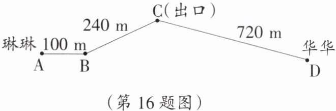 16. 较难题 如图,琳琳和华华相约周末到家乡美食小镇游玩,两人同时分别到达小吃摊位$A和D$,并约在出口$C$会合,琳琳从$A经过B$摊位,最后到达出口$C$,华华从$D摊位直接前往出口C$,速度与琳琳从$B到C$的速度相同,两人在每两个地点间均匀速前进。若琳琳从$A到B的速度比从B到C的速度慢10m/min$,且从$A到B的时间为从B到C$时间的一半,则______(填“琳琳”或“华华”)先到达出口$C$。
