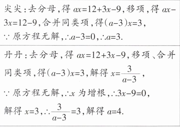 12. 中考新趋势 “若关于$x的方程\frac{ax}{3x - 9} = \frac{12}{3x - 9} + 1$无解,求$a$的值。”尖尖和丹丹的做法如下: