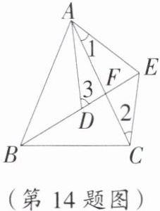 14. 选择结论的开放性试题 推理能力 如图,已知AB= AC,AD= AE,BD= CE,且B,D,E三点共线,请从下列结论:①∠3= ∠1+∠2;②∠BAC= ∠BEC,选择一个证明.