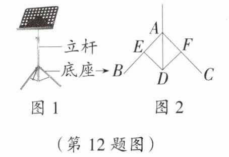12. 抽象能力 如图1是一乐谱架,其立杆可进行高度调节,图2是底座部分的平面图,其中支撑杆AB= AC,E,F分别为AB,AC的中点,ED,FD是连接立杆和支撑杆的支架,且ED= FD.立杆在伸缩过程中,总有△AED≌△AFD,其判定依据是