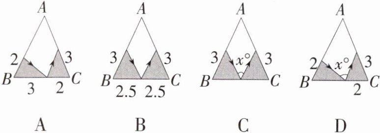 6. 较难题有一张三角形纸片ABC,已知∠B= ∠C= x°,BC= 5,按下列方案用剪刀沿着箭头的方向剪开该纸片,得不到全等三角形纸片的是(