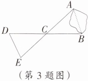 3. 习题变式教材P50,T6改编如图,A,B两点分别位于一个池塘的两侧,池塘西边有一座水房D,在BD的中点C处有一棵百年古树,小明从A出发,沿直线AC一直向前经过点C走到点E(A,C,E三点在同一条直线上),并使CE= CA,然后他测量点E到水房D的距离,则DE的长度就是A,B两点之间的距离。