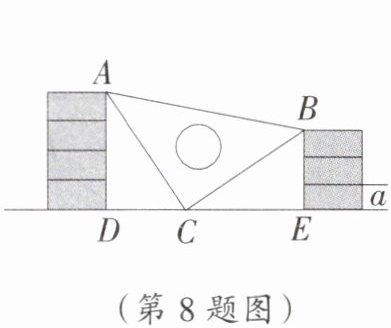 8. 一天课间,顽皮的小明同学拿着老师的等腰直角三角板玩,不小心将三角板掉到两根柱子之间,如图所示,这一幕恰巧被数学老师看见了,于是有了下面这道题。如果每块砖的厚度a= 10cm,则DE的长为(