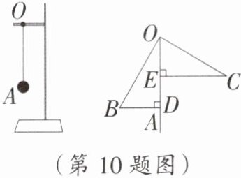 10. 跨学科物理小明在物理课上学习了发声物体的振动实验后,对其作了进一步的探究:在一个支架的横杆点O处用一根细绳悬挂一个小球A,小球A可以自由摆动,如图,OA表示小球静止时的位置。当小明用发声物体靠近小球时,小球从OA摆到OB位置,此时过点B作BD⊥OA于点D,当小球摆到OC位置时,OB与OC恰好垂直(图中的A,B,O,C在同一平面上),过点C作CE⊥OA于点E,测得CE= 15cm,OE= 8cm。