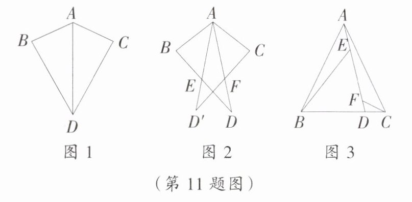 (2)操作二:对折后,将风筝纸片剪成两个三角形(△ABD和△ACD'),摆成如图2所示的图形,BD与AD'相交于点E,AD与CD'相交于点F。试说明BE= CF;
