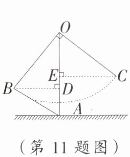 11. 抽象能力 小丽与爸妈在公园里荡秋千.如图,小丽坐在秋千的起始位置 A 处,OA 与地面垂直,两脚在地面上用力一蹬,妈妈在距地面 1 m 高的 B 处接住她后用力一推,爸爸在 C 处接住她.若妈妈与爸爸到 OA 的水平距离 BD,CE 分别为 1.4 m 和 1.8 m,∠BOC= 90°.爸爸在 C 处接住小丽时,小丽距离地面的高度是(