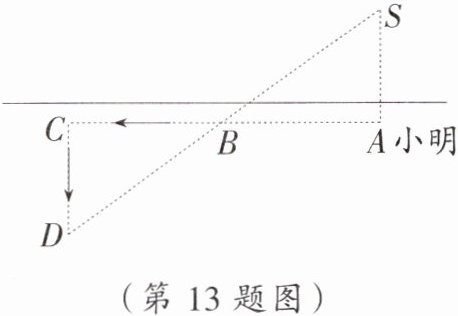 13. 应用意识 如图,小明站在堤岸的 A 点处,正对他的 S 点停有一艘游艇.他想知道这艘游艇距离他有多远,于是他沿着堤岸走到电线杆 B 旁,接着再往前走相同的距离,到达点 C.然后他向左直行,当看到电线杆与游艇在一条直线上时停下来,此时他位于点 D,量得 CD 的距离是 35 m.你知道在点 A 处小明与游艇的距离吗? 请说出他这样做的理由.