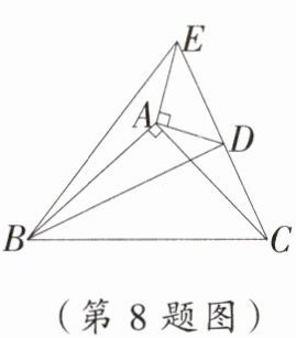 8. 如图,在△ABC,△ADE 中,∠BAC= ∠DAE= 90°,AB= AC,AD= AE,点 C,D,E 三点在同一条直线上,连接 BD,BE.以下四个结论:①BD= CE;②∠ACE+∠DBC= 45°;③BD⊥CE;④∠BAE+∠DAC= 180°.其中结论正确的个数是(