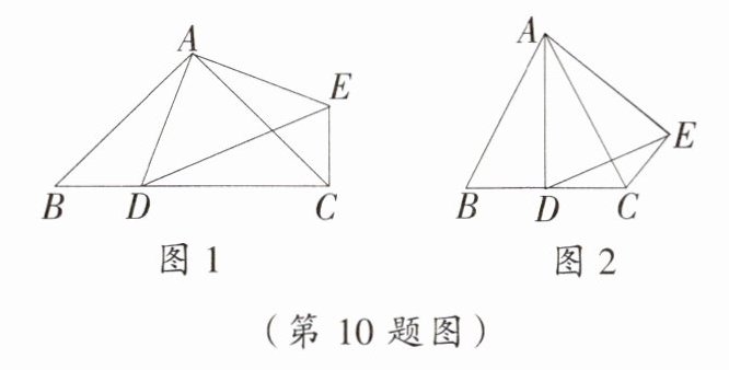 10. 推理能力 在△ABC 中,AB= AC,D 是线段 BC 上一点(不与 B,C 重合),以 AD 为一边在 AD 的右侧作△ADE,使 AD= AE,∠DAE= ∠BAC,连接 CE.