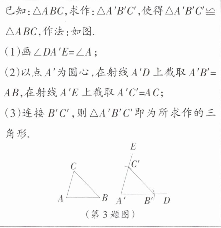 3. 习题变式教材P61,T2改编 如图是我们作一个三角形与已知三角形全等的方法: