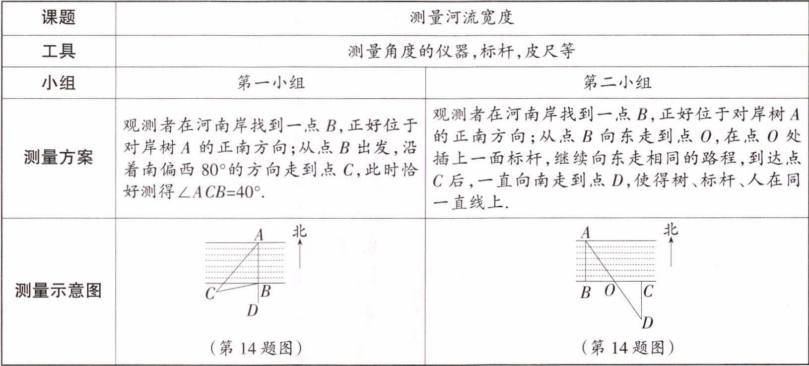 14. 流经官渡古镇的宝象河两岸风光旖旎,是附近居民散步休闲的好去处,为了测量宝象河平行两岸的宽度,两个数学研究小组设计了不同的方案,如下表: