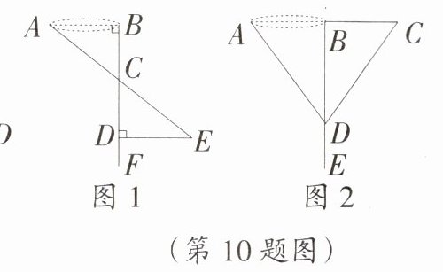 10. 中考新趋势 为测量一池塘两端 $A$,$B$ 间的距离。甲、乙两位同学分别设计了两种不同的方案。甲:如图 1,先过点 $B$ 作 $AB$ 的垂线 $BF$,再在射线 $BF$ 上取 $C$,$D$ 两点,使 $BC = CD$,接着过点 $D$ 作 $BD$ 的垂线 $DE$,交 $AC$ 的延长线于点 $E$。则测出 $DE$ 的长即为 $A$,$B$ 间的距离;乙:如图 2,先确定直线 $AB$,过点 $B$ 作射线 $BE$,在射线 $BE$ 上找可直接到达点 $A$ 的点 $D$,连接 $DA$,作 $DC = DA$,交直线 $AB$ 于点 $C$,则测出 $BC$ 的长即为 $AB$ 间的距离,则下列判断正确的是(