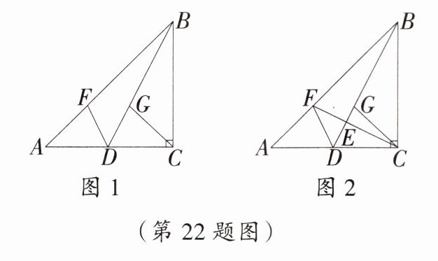 22. (7 分)如图,在 $\triangle ABC$ 中,$CA = CB$,$\angle ACB = 90^{\circ}$,$\angle A = 45^{\circ}$,$AD = CD$,$\angle ACB$ 的平分线 $CG$ 交 $BD$ 于点 $G$,作 $\angle FDA = \angle BDC$。