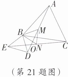 21. (7 分)推理能力 将等边三角形 $ABC$ 与等边三角形 $BDE$ 按如图所示的位置放置,连接 $AD$,$CE$,交点为 $O$,$M$,$N$ 分别是线段 $AD$,$CE$ 的中点,连接 $BM$,$MN$,$BN$。