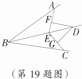 19. (6 分)如图,$BD$ 是 $\angle ABC$ 的平分线,$AB = BC$,点 $E$ 在 $BD$ 上,连接 $AE$,$CE$,过点 $D$ 作 $DF \perp AE$,$DG \perp CE$,垂足分别是 $F$,$G$,$EF = 3$。