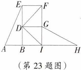 23. (7 分)如图,小北在公园玩双层型滑梯,每层楼梯的高度相同($BD = DE$),都为 $2$ m,他想知道左右两个滑梯 $AE$ 和 $GH$ 的长度是否相等,于是制定了如下方案: