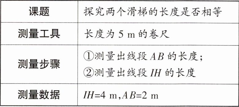 (1)根据小北的测量方案和数据,判断两个滑梯 $AE$ 和 $GH$ 的长度是否相等?并说明理由;