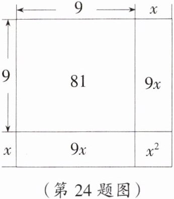 24. (8 分)小李同学探索$\sqrt{86}$的近似值的过程如下:∵面积为 86 的正方形的边长是$\sqrt{86}$,且$9<\sqrt{86}<10$,∴设$\sqrt{86}= 9 + x$,其中$0<x<1$,画出示意图,如图所示。根据示意图,可得图中正方形的面积$S_{正方形}= 81 + 2×9x + x^2$,又∵$S_{正方形}= 86$,∴$81 + 2×9x + x^2 = 86$。当$x^2<1$时,可忽略$x^2$,得$81 + 18x\approx86$,解得$x\approx0.28$,∴$\sqrt{86}\approx9.28$。