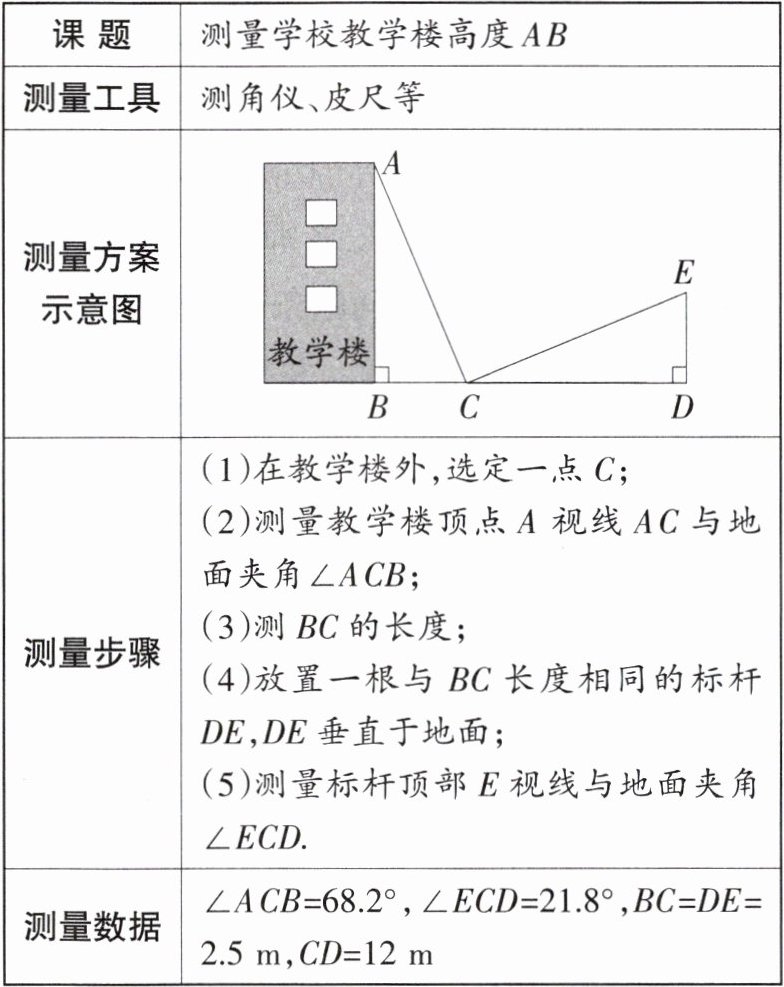 2. 中考新考法 项目化学习 八年级数学兴趣小组开展了测量学校教学楼高度 $ AB $ 的实践活动,测量方案如下表: